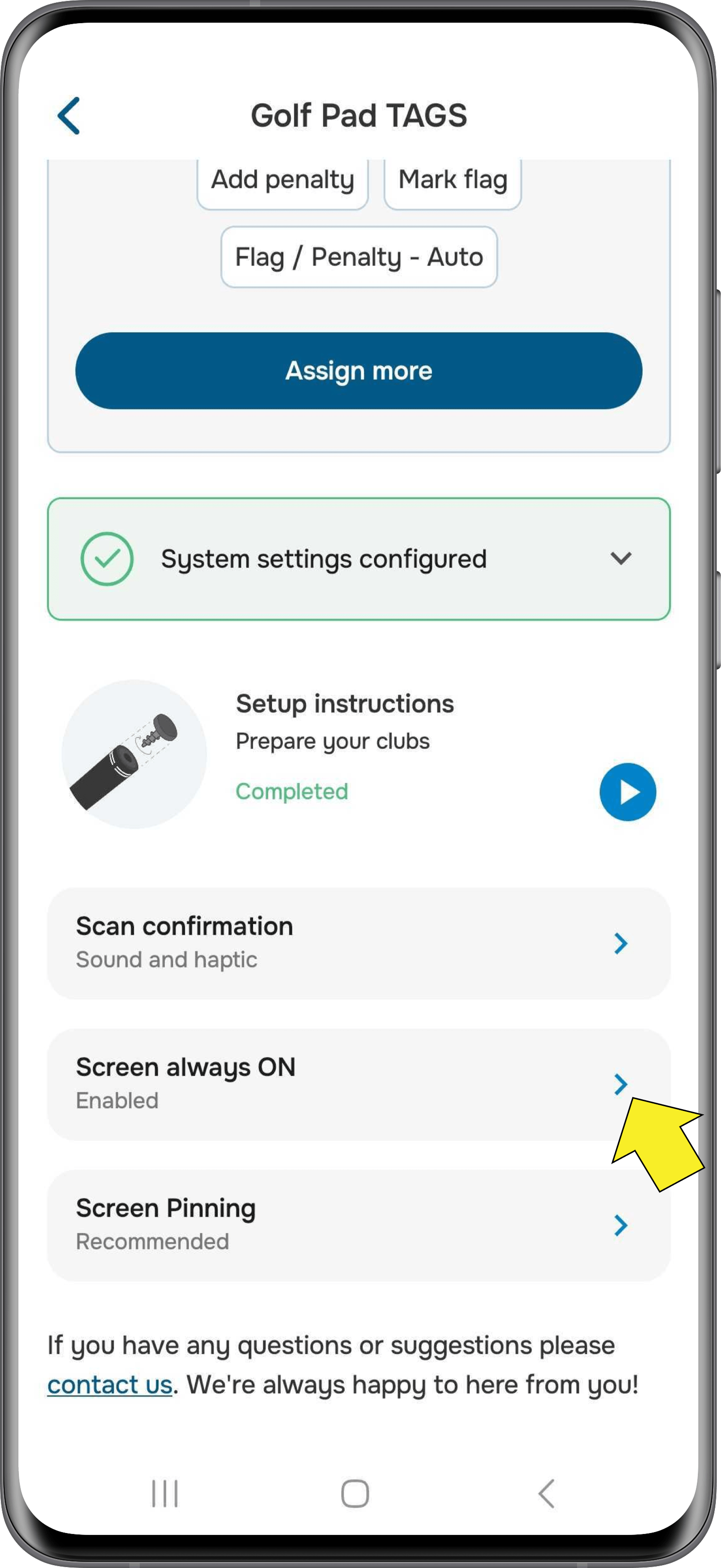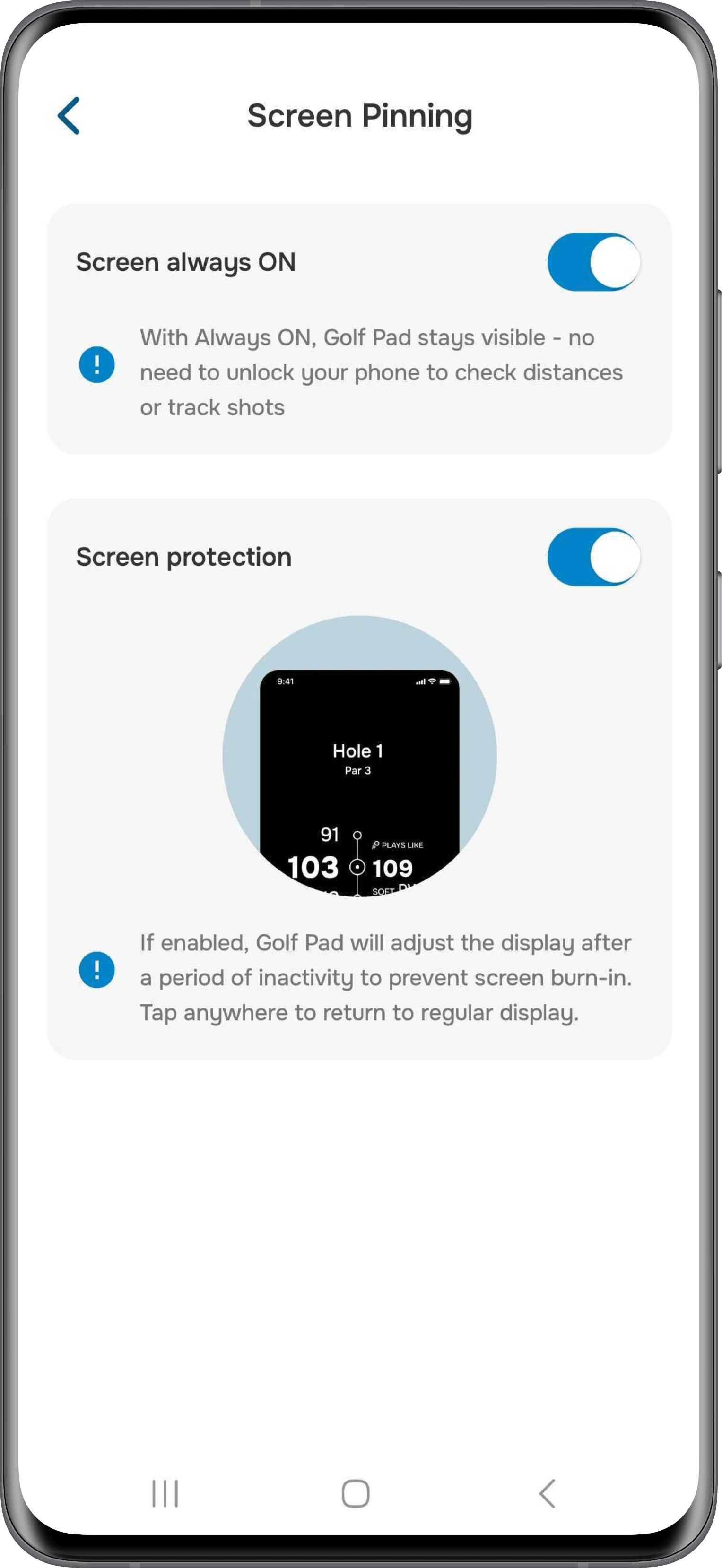 1) If you choose the first option, the screen will be set to "always on", keeping the app visible throughout your round. This way, you won't need to unlock your phone to check distances or track shots. You can adjust this setting during test mode or later in TAGS settings > Screen always ON. NOTE: We recommend enabling screen protection in the settings to prevent screen burn-in.