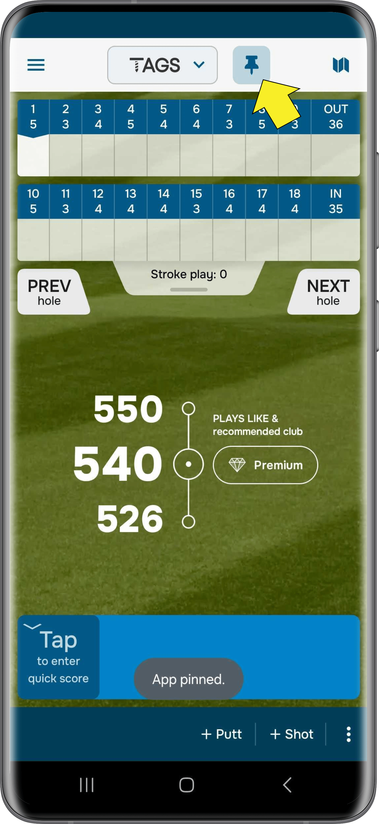 2) You can keep your phone in your pocket during the round – just place it there as shown in the image below: screen facing inward and the phone placed upside down. The screen will remain on, but accidental touches will be blocked. NOTE: We recommend avoiding pressing the power button. However, if you prefer to use it, make sure to pin the app before doing so.