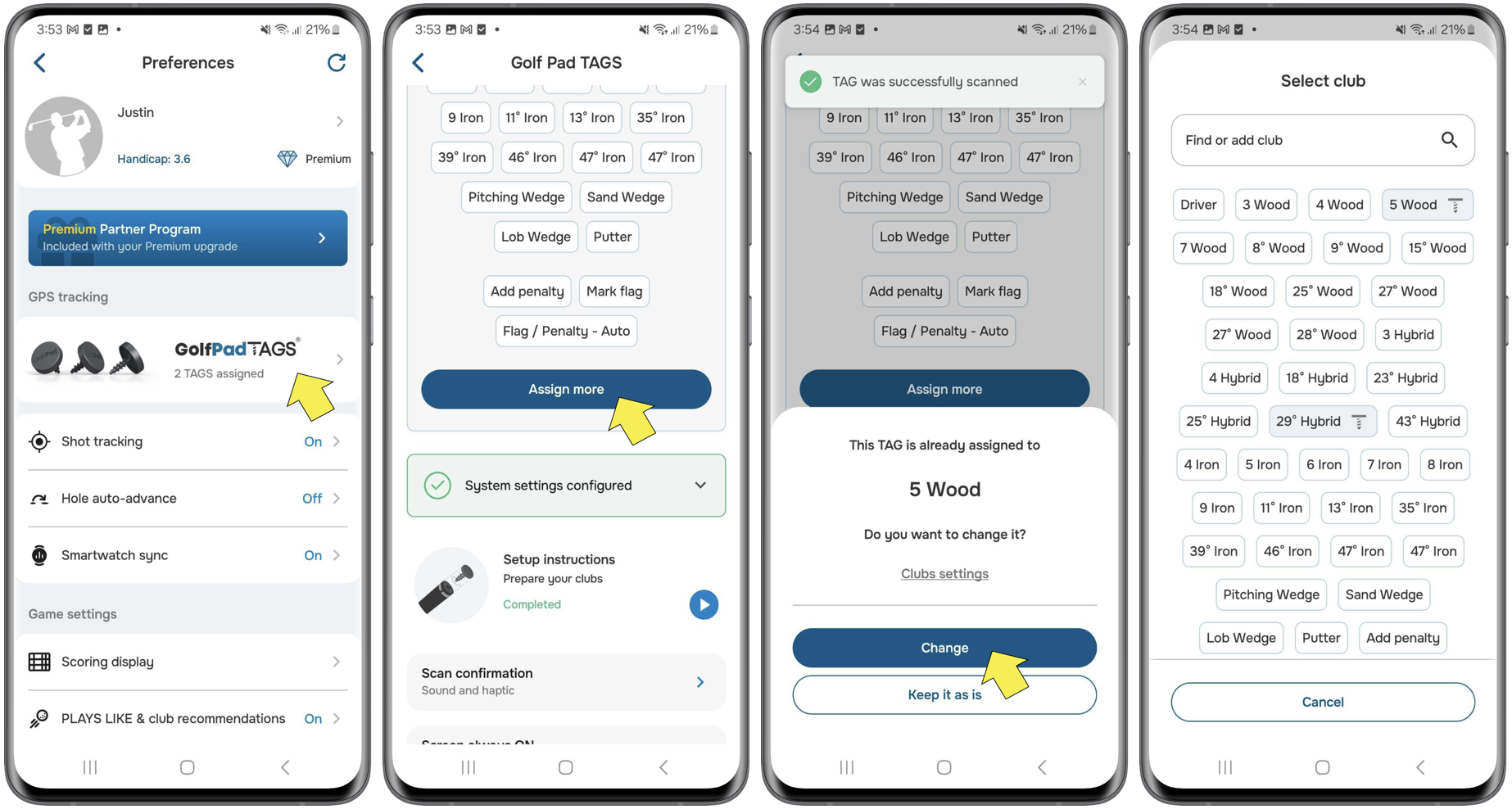 Absolutely! To change a club assignment, go to Preferences > Golf Pad TAGS, then tap "Assign more" and scan the TAG you want to reassign. Next, tap "Change" to choose a new club from the list.